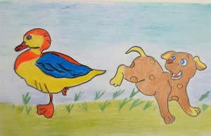 Köpekçik: ‘ Bu sevimli ördek çik acaba arkadaş olur mu? ‘ . diye akılarından geçirmişler.