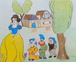 Pamuk Prenses ağlayarak başından geçenleri anlatınca cüceler çok üzülmüşler o zaman ‘ Biz dağların derinliklerinde gümüş madeninde çalışan cüceleriz. Bizi kimse bulamaz . Sende bizimle kal bize yardım edersin. Üvey annen seni burada bulamaz demiş.