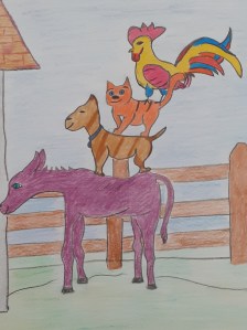 Eşek dayanamayıp ‘ Horoz kardeş derdin nedir neden bu haldesin ‘ demiş. Horozda olanı biteni anlatmaya başlamış ‘ Ben artık çok yaşlandım. Tavukları idare edemediğimi düşünene sahibim benden rahatsız. Bu akşamda misafirleri var . Bana öyle geliyorken beni pişirip yedirecek ‘ demiş. Eşek ‘ Vah vah horoz kardeş bizde evlerimizden ayrıldık Bremen e gidip orada şarkıcılık yapacağız ‘ demiş. Horoz canın kurtulacağını anlayınca çok sevinmiş düşmüşler yola .Şimdi dört arkadaş şarkı söyleyerek yollarına devam ediyorlarmış.