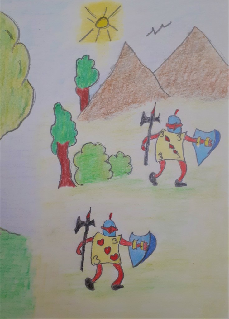 Bahçenin girişinde büyük beyaz gülleri olan bir gül ağacı vardı.Fakat üç bahçıvan bu gülleri kırmızıya boyamaya çalışıyordu. Alıce bunun çok garip olduğunu düşündü üç iskambil kağıdı beyaz gülleri kırmızıya boyamaya çalışırken sürekli tartışıyordu.