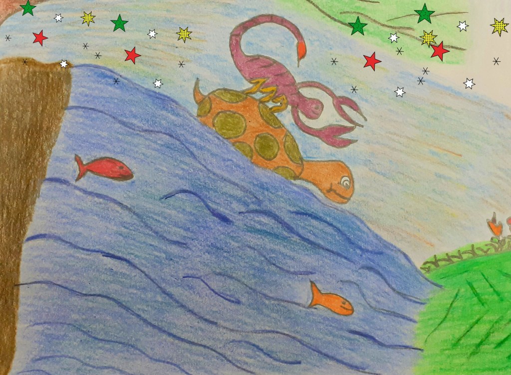 Bunun üzerine kaplumbağa akrebi sırtına alıp karşı kıyıya taşımaya başlamış. Akrep halinden çok memnunmuş ama genede akrep bu  sokmadan durur mu? ‘ Dayanamamış kaplumbağayı sokmuş .