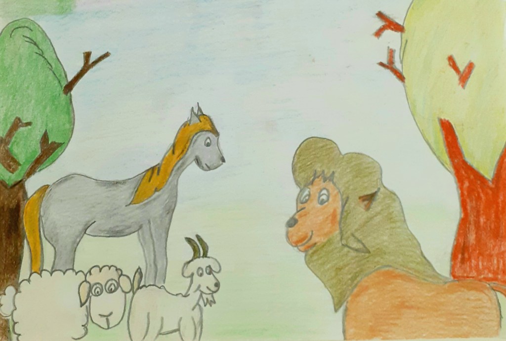 Uzun uzun zaman önce bir ülkede yaşayan bir Keçi, Koyun, Kısrak ve Aslan bir ormanda yaşarmış. Kısrak, Keçi ve kız kardeşleri Koyun aslanla ortak olmuşlar. Yaman bir aslanmış bu çevrenin derebeyi. Kazançta da kayıpta da ortağız demişler ve anlaşmışlar. Keçi bir tuzak kurmuş sonunda ağlarına bir geyik düşmüş. Keçi buna çok sevinmiş hemen ortaklarına haber vermiş. Hemen toplanmışlar hemen Aslan büyük pençeleriyle paylaştırmaya koyulmuş.