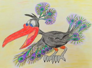 A CROW WEARING PEACOCK WINGS