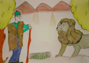 Daha bunu söyler söylemez Aslan çıkıp gelmesin mi. Çoban bakmış aslan tuzağa doğru geliyor. Korkudan yerlere serilip saklanmaya çalışmış. Tanrılara dua etmiş. ‘ Zeus ben yanlış yaptım. Görmek istedim. Sürümü talan eden hırsızı görmek istedim . Hatta ettim. Sen beni o aslandan beni kurtar; değil dana değil sana öküz kurban ‘ edeyim demiş.