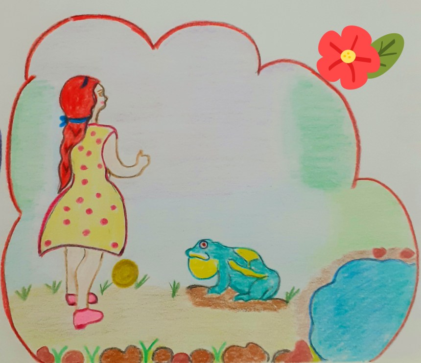 Prenses ağlamaya başlamış.’ Topum göle düştü. Topum göle düştü diye ‘ bağırmış çağırmış ama sesini duyan olmamış. Oda dayanamayıp ağlamaya başlamış. ‘ Altın topum altın topum’ diye ağlarken birden küçük bir kurbağa belirmiş .